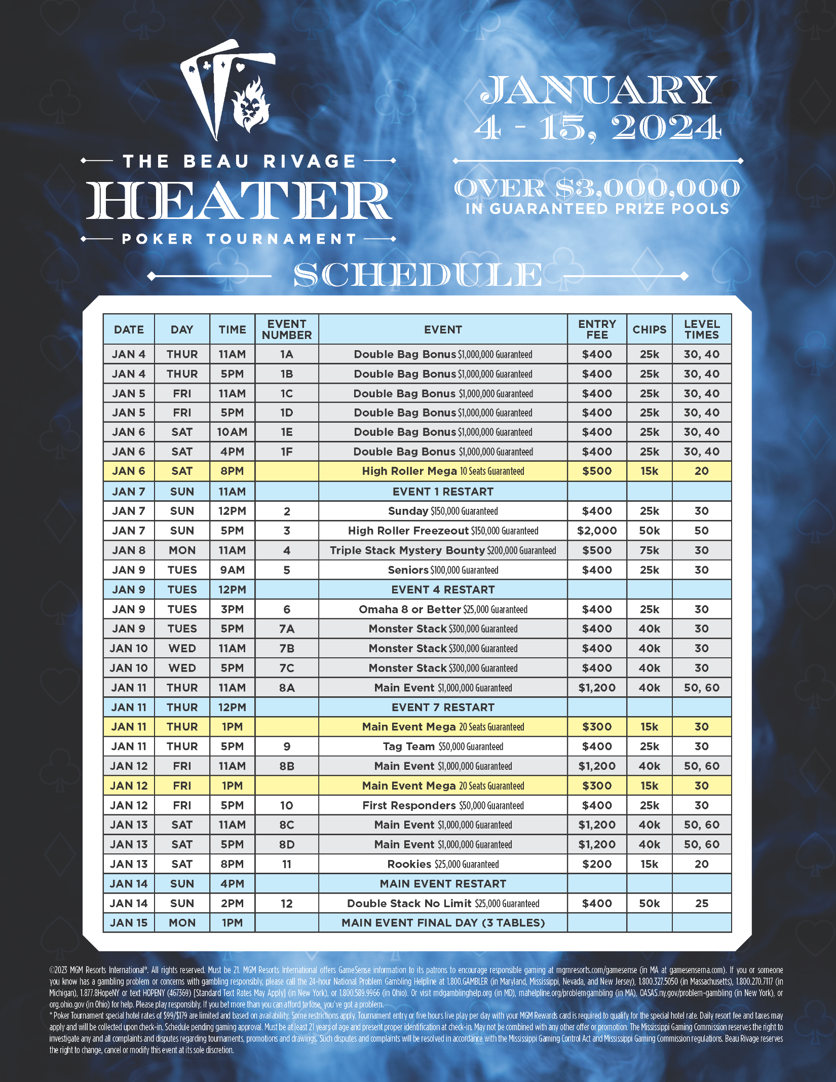 The poker room is open to guests daily from 10 a.m. – 4 a.m. with daily tournaments and promotions. For more information, visit www.beaurivage.com