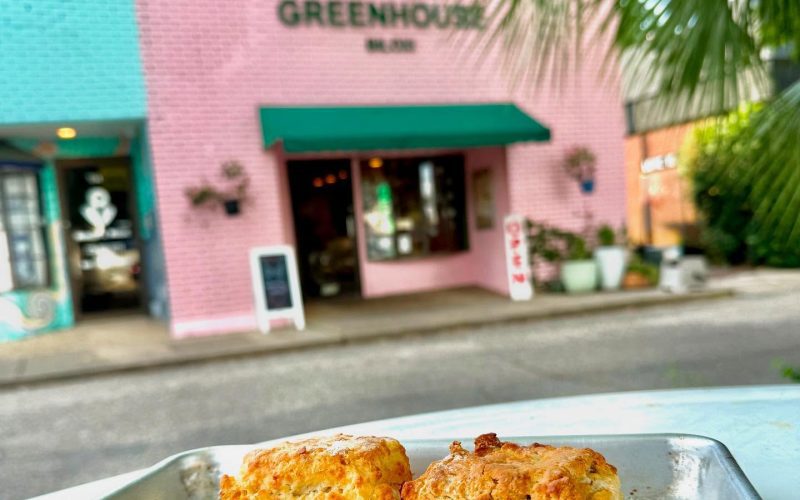 The Greenhouse Biloxi is a quaint little bohemian style coffee and biscuit shop located right in the center of Vieux Marche.  On the side of a building, next door to Marley’s Records, at 152 G E Ohr St., there is ample parking.  Old downtown Biloxi has so many businesses including the hospital, main bank branches, law offices, engineering firms, restaurants and bars, all with employees who can use a little nosh and giddy-up before or during their busy day.  Operating hours are from 7am to 2pm serving breakfast and lunch and some super coffees, espresso, teas, brunch cocktails and other drinks.